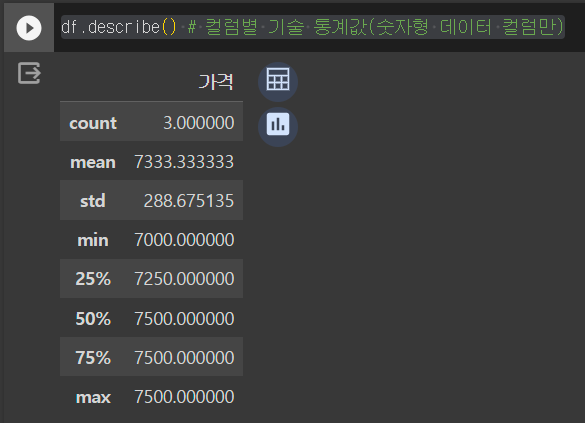 df.describe() # 컬럼별 기술 통계값(숫자형 데이터 컬럼만)