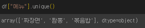 df["메뉴"].unique() # 다수 컬럼 동시 진행 불가