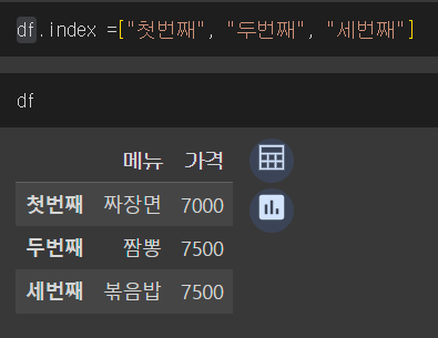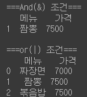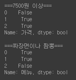 condi_price = df["가격"] >= 7500 # 충족하는 것은 "짬뽕", "볶음밥"