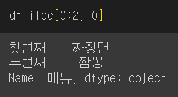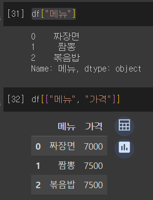 df[["메뉴", "가격"]] # 2개 이상 시(데이터 프레임으로 반환)