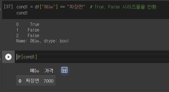 cond1 = df["메뉴"] == "짜장면" # True, False 시리즈들을 반환