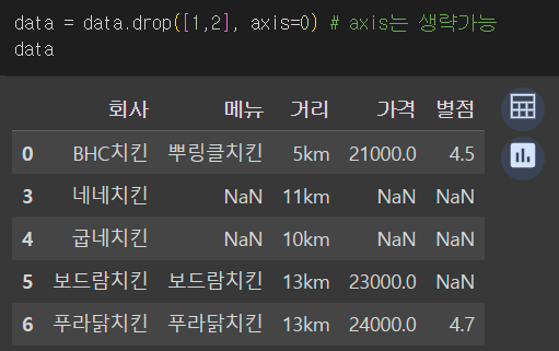 data = data.drop([1,2], axis=0) # axis는 생략가능