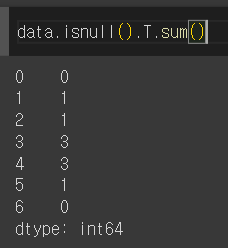 ★ T 또는 Transpose() 를 하여 전치하면 행별 결측치 개수 또한 쉽게 확인 가능하다.