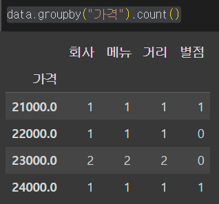 data.groupby("가격")[["회사","메뉴"]].count() # Dataframe으로 반환
