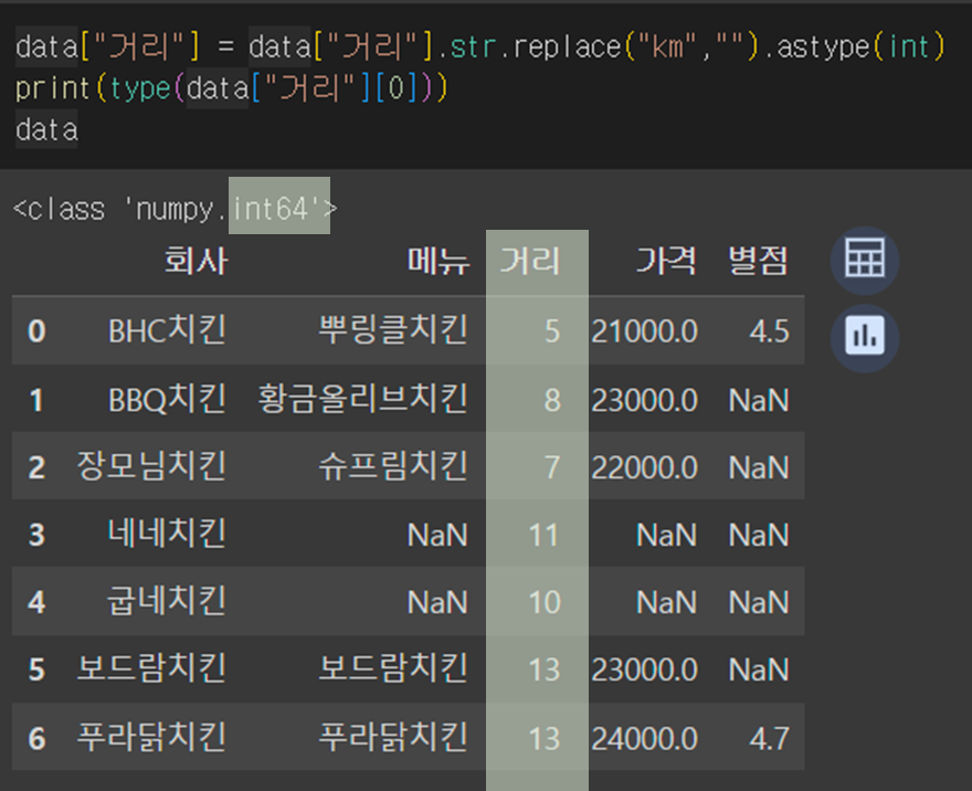 data["거리"] = data["거리"].str.replace("km","").astype(int)