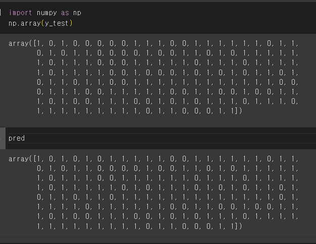 현재는 '회귀'가 아닌 '분류'모델이기 때문에 MSE같은 값들로 검증하는 것이 아닌, y_test(검증데이터)와 pred(학습데이터 기반 예측값)을 비교함으로써 정확도를 검증한다.