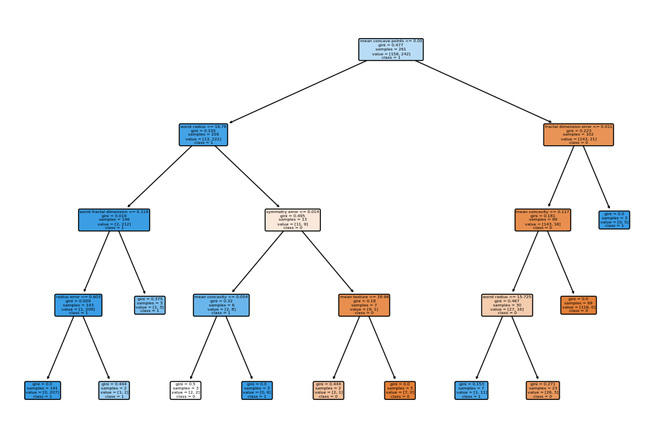 plot_tree(tree, feature_names=list(x_train.columns), class_names=['0', '1'], filled=True, rounded=True)