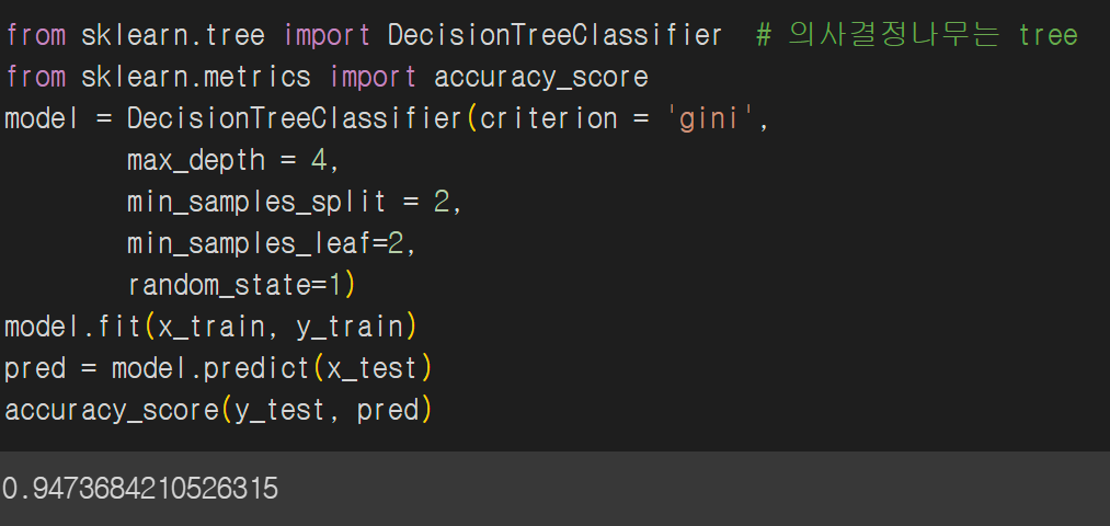4. min_samples_leaf=2, # default = None 리프노드가 최소로 가져야 할 샘플 개수(value 개수) (과대적합 배제)
