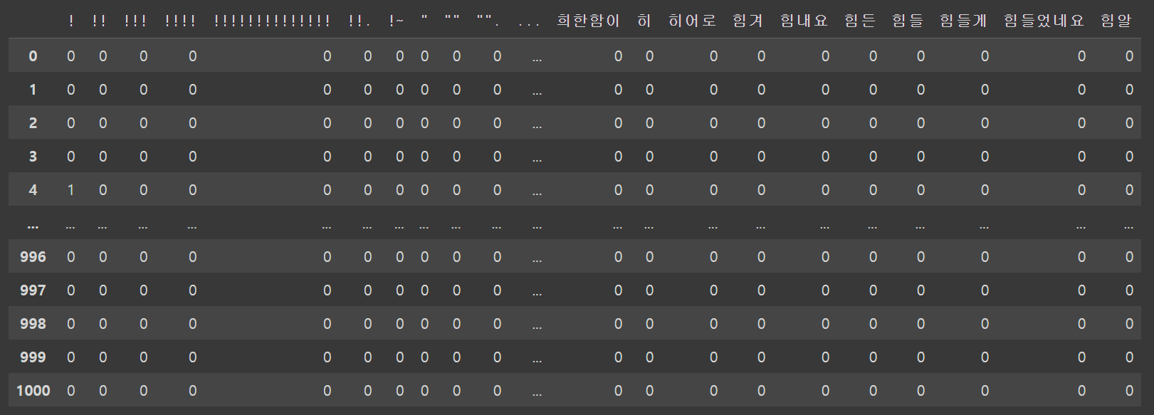 단순히 단어의 빈도만으로 벡터화시키는 도구이다. 1000개의 문장만 학습해보도록 하자