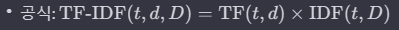 위와 같은 수식을 통해 가중치가 결정되어, 전체적으로 희소한 단어는 높은 가중치를, 문장 내에서 빈도가 높은 단어에 높은 가중치를 엮어서 주는 형식으로, 단순히 전체적으로 빈도가 높고 문장 내에서 빈도가 높은 단어의 가중치는 낮아진다.